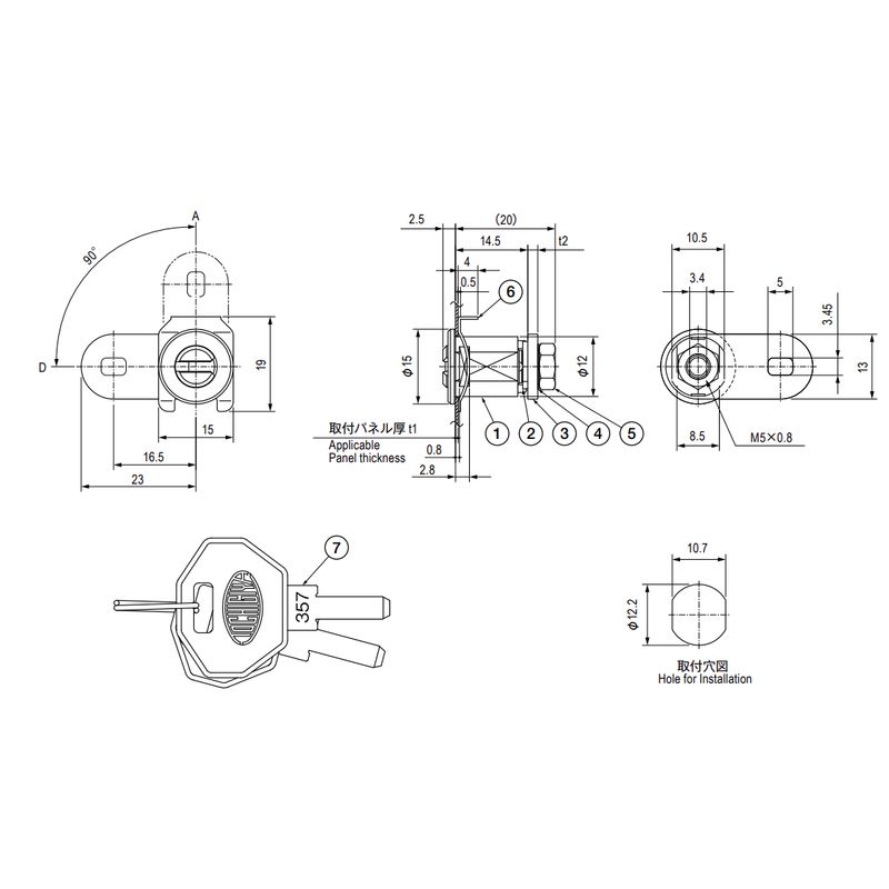 キーの回転は、D・A間90°回転です。キーの抜差しは、D点でのみ可能です(1点抜き)。(2点抜きは製作しておりません。)「錠前の注意事項」もご確認ください。