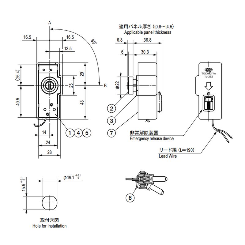 キーの抜き差しはA点のみ可能(1点抜き)キーの回転はA・B間90°回転(常時回転可能)。ただし、B・A間90°回転はソレノイドに通電させるか、非常解除装置を操作しなければ回転できません。マイクロスイッチはA位置より約80°の位置から作動します。「錠前の注意事項」もご確認ください。