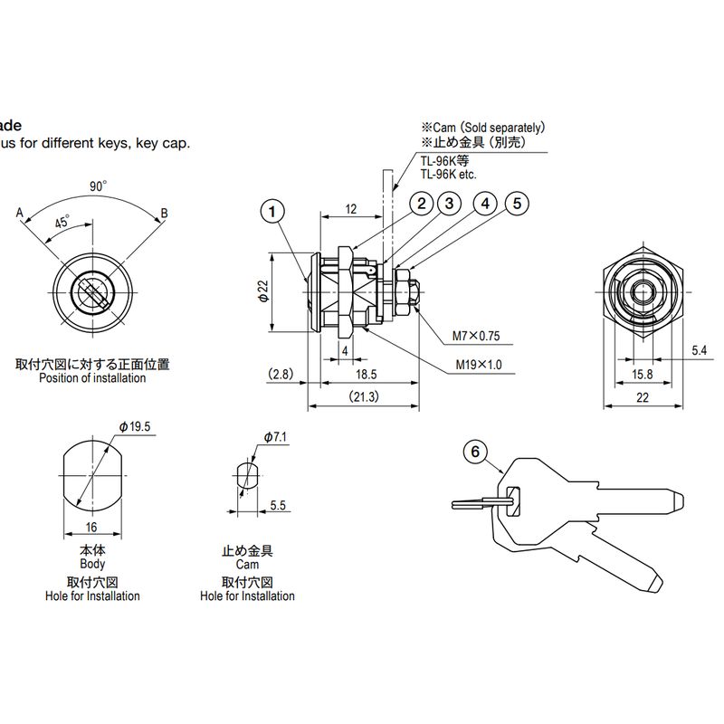豊富な鍵違い(受注生産)が製作可能な錠前です。樹脂製のキーキャップ仕様(受注生産)も承ります。