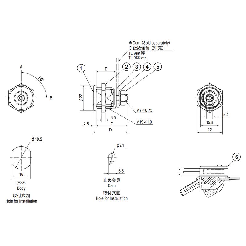 キーの回転は、A・B間90°回転です。キーの抜差しは、A点でのみ可能です(1点抜き)。「錠前の注意事項」もご確認ください。