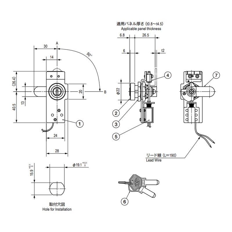 キーの抜き差しはA点のみ可能(1点抜き)キーのA・B間90°回転は、ソレノイドに通電させなければ回転できません。B・A間90°回転は、常時回転可能です。マイクロスイッチはA位置より約80°の位置から作動します。「錠前の注意事項」もご確認ください。