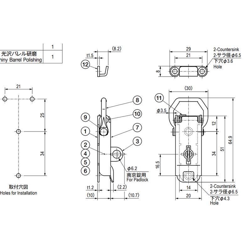 簡易ロック付きのステンレス製アームキャッチです。南京錠(TL−285J)用の穴が開いています。締付時にキーパーの左右のズレを中央へ引き寄せます。