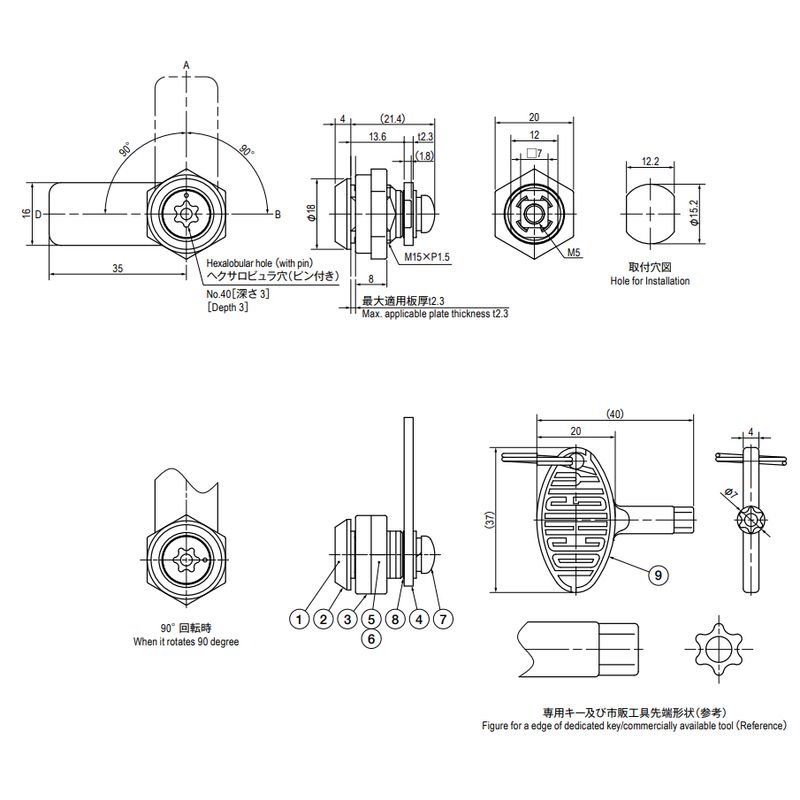 本品の施解錠には別売りの専用キー[TL−407−2]をご使用頂くか、市販の[ヘクサロビュラ穴(ピン付き)”No.40”用工具]をご使用下さい。