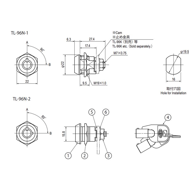 キーの回転は、A・B間90°回転です。
