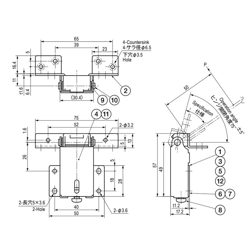 約35°~75°(ばね力と蓋の重量とのバランスによる。)