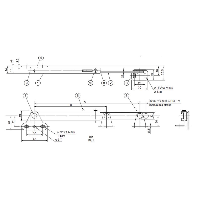 扉高さ、扉開き角度に応じて、上下ブラケットの位置を適宜に決めることができますが、この場合、閉扉時のB1寸法(図2)は図1のB寸法より小さくならないようにブラケット位置をお決め下さい(小さい場合は蝶番やフラップステーを破損する場合があります)。