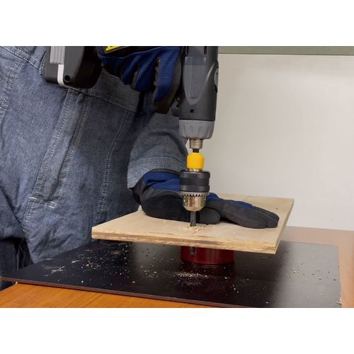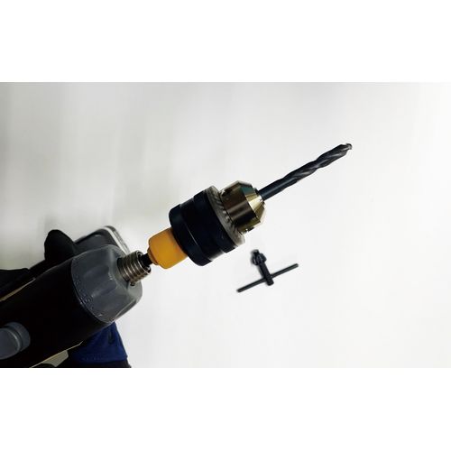 充電ドリルドライバーに取付けて、穴あけ、軸付き砥石で研削作業が可能。