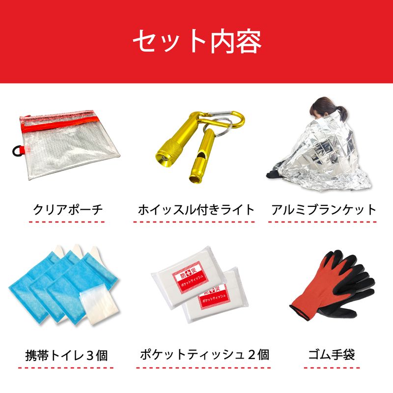 クリアポーチ、ホイッスル付きライト、アルミブランケット、ポケットティッシュ×2、携帯トイレ×3、ゴム手袋