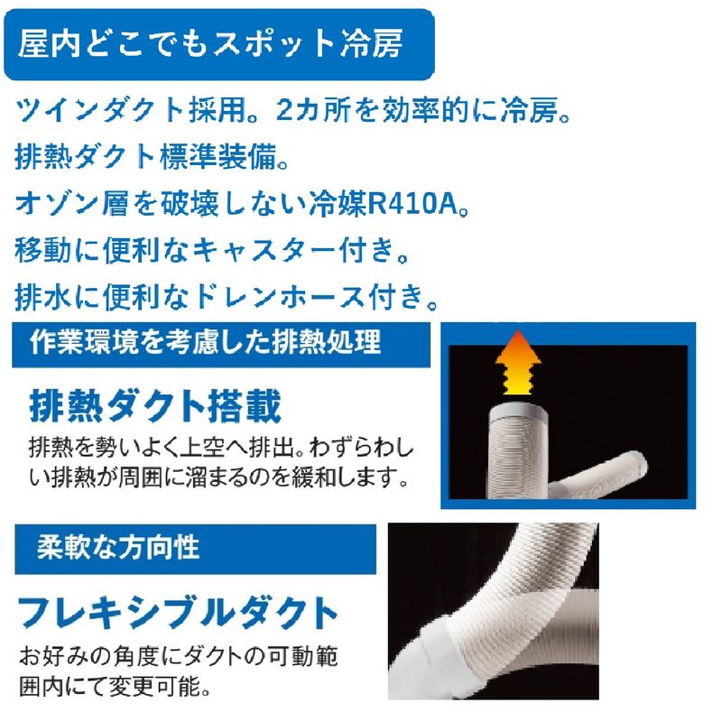 好きな角度に風向を変えられるフレキシブルダクト2本仕様でより現場を涼しくする