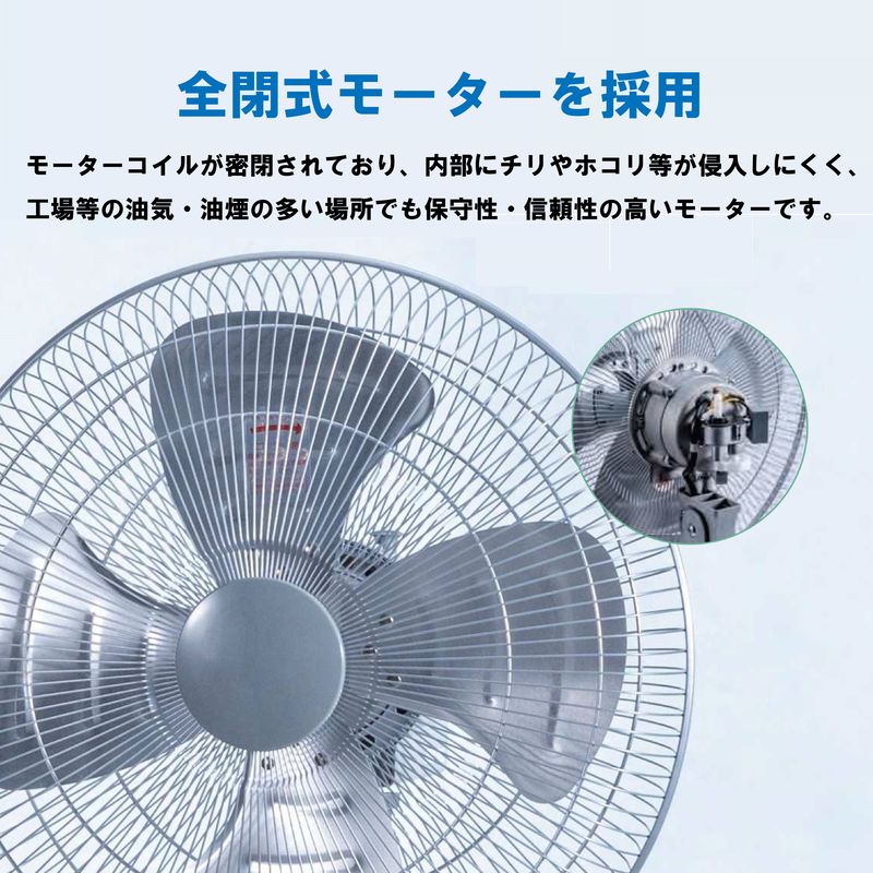 左右自動首振り(後部つまみ式、約80度)、上下首折れ(手動式、4段階)