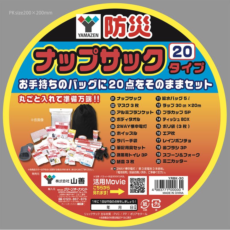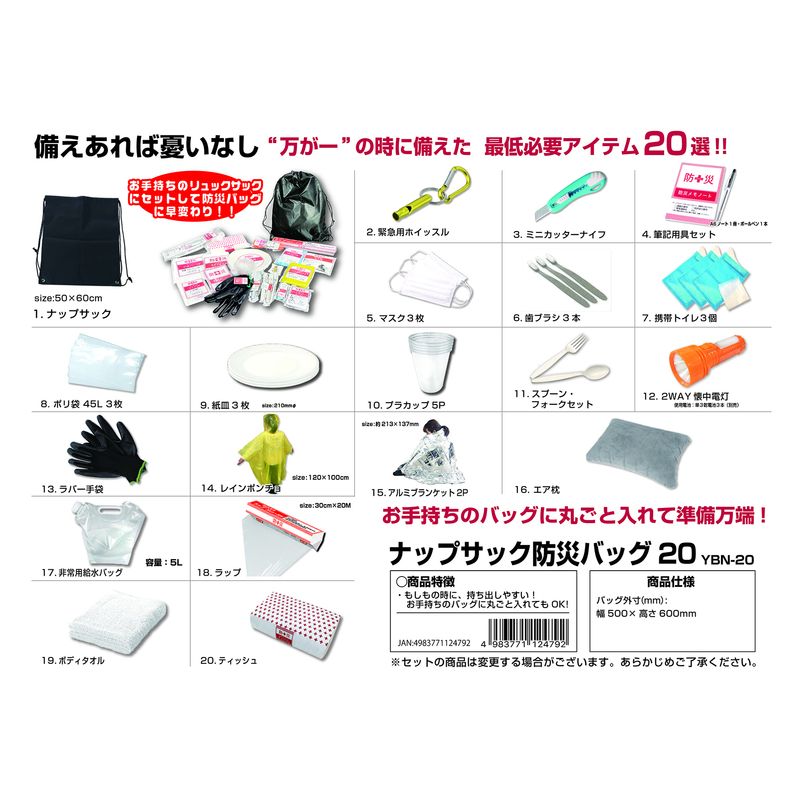 ナップサック、緊急用ホイッスル、ミニカッターナイフ、筆記用具セット、歯ブラシ3本、マスク3枚、携帯トイレ3個、ポリ袋45L3枚、紙皿3枚、プラカップ5P、スプーン&フォークセット、2WAY懐中電灯、ラバー手袋、レインポンチョ、アルミブランケット、エア枕、非常用給水バック5L、ラップ、ボディタオル、テッシュ