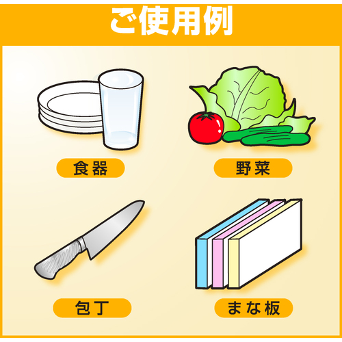流水の場合、食器及び調理用具は5秒以上、野菜・果物は30秒以上、ため水の場合は水をかえて2回以上すすいでください。