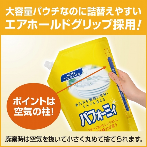 エア入りの持ち手がついたパウチ仕様は持ちやすく、つぎ足しの作業もラクにできます。