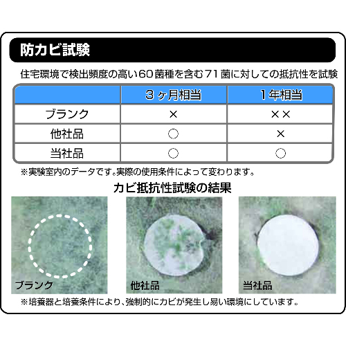 約60種類のカビ全てを含む2000種類以上の菌に効果のある防カビ抗菌剤を使用しています。