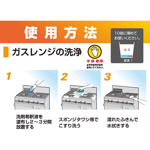 ガスレンジ・フライヤーなどの洗浄、床の洗浄に。