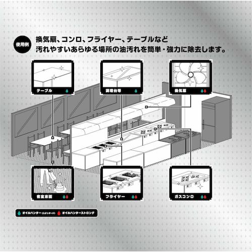 テーブル、調理台、換気扇、客室床面、フライヤー、ガスコンロなど汚れやすいあらゆる場所の油汚れ。