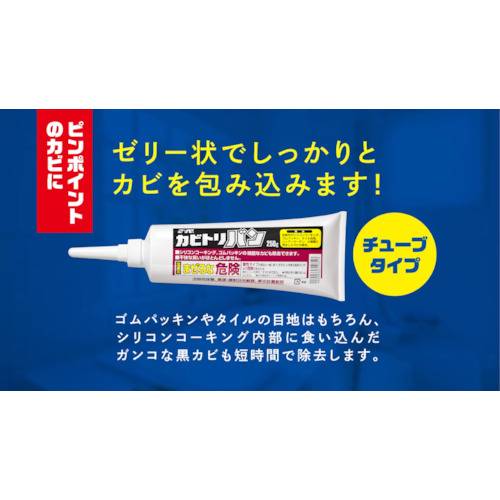 ゼリー状のカビ取り剤でたれにくく、浴室内のゴムパッキンやタイルの目地はもちろん、シリコンコーキング内部に食い込んだ頑固な黒カビにも密着し強力に除去します。